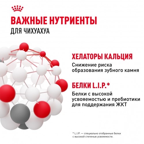 Гранулы ROYAL CANIN® Chihuahua Adult (ЧИХУАХУА ЭДАЛТ) форма, размер и текстура которых созданы специально для собак породы чихуахуа, а также они обладают высокой вкусовой привлекательностью, благодаря тщательно подобранному ароматическому профилю. Также за счет содержания специальных минеральных веществ и специально подобранной текстуре гранул, которая оказывает чистящее воздействие, продукт помогает ограничить образование зубного камня и поддерживает здоровье зубов.